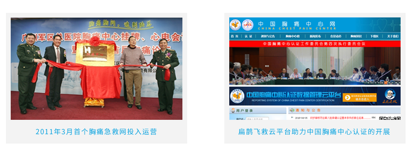 中国人民解放军总医院(301医院)胸痛中心2014年引进了扁鹊飞救®系统等信息网络技术,该技术包括了蓝牙12导联实时心电传输系统、院前急救电子病历系统、急救时间管理系统、胸痛数据分析与挖掘系统,通过3G/4G和卫星传输技术,可实时传输心电图、血氧、血压等数据,实现了胸痛中心和救护车、急诊科之间信息的实时传输,做到了患者未到、信息先到,高危患者可直接启动急救绿色通道,争取救治时间,进一步降低了死亡率,此外还可以对远程急救现场进行诊疗指导,提高了基层医院的救治技术。